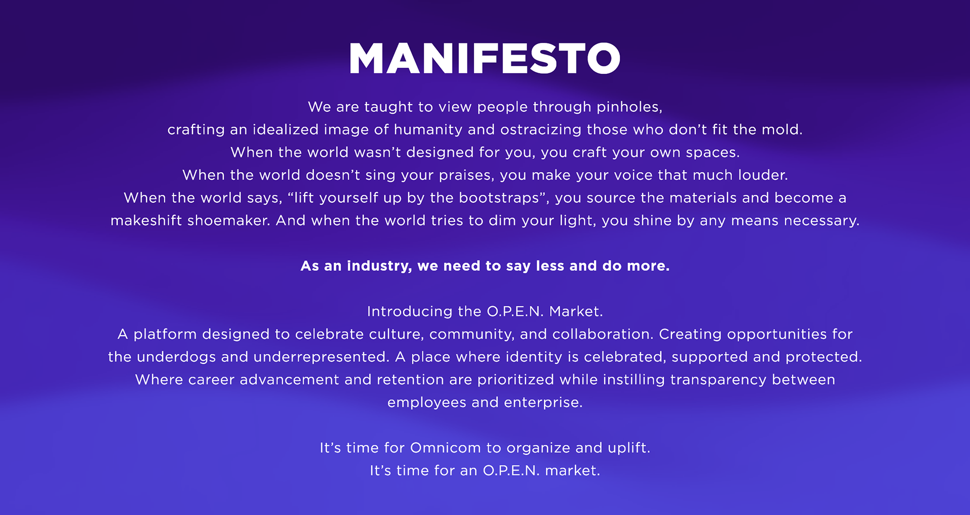 Open Market is the product of the Adobe Omnicom Creative Jam 2021. Multiple Omnicom teams were formed in the pursuit of creating a platform or extension for Omnicom to implement into their company system. Within the given time period of a week, our team was able to collaborate and executing a prototype that spotlighted agency talents, provide different areas of opportunity, and instilled transparency of employee salary, stories, and more.